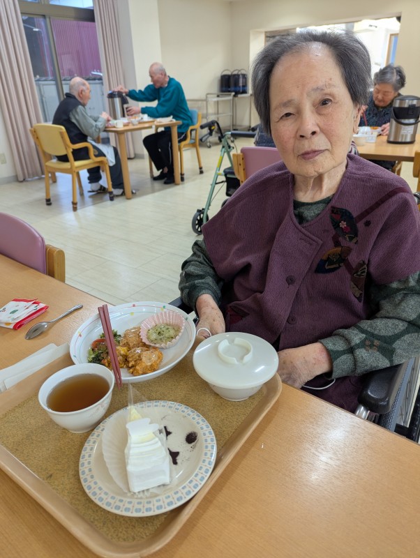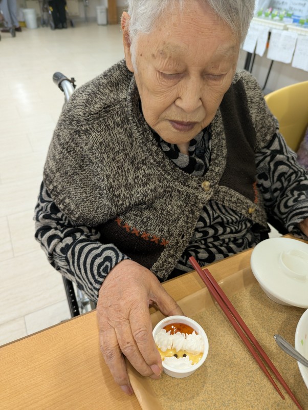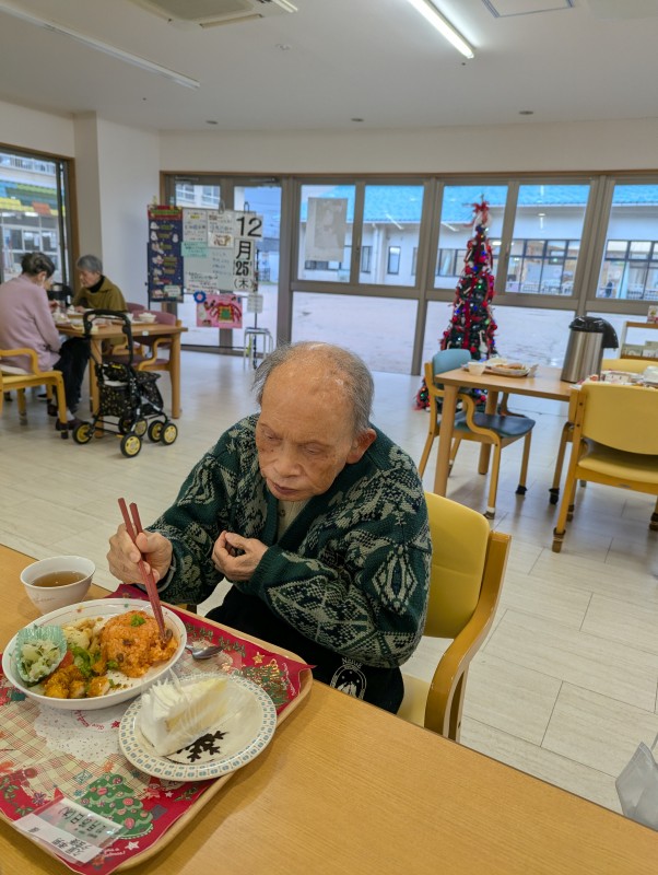 24日はサンタプリン、25日はチキンライス・エビフライ・クリームコロッケ・ミートグラタン・エビと玉ねぎのマリネ・クリスマスケーキを提供しました。