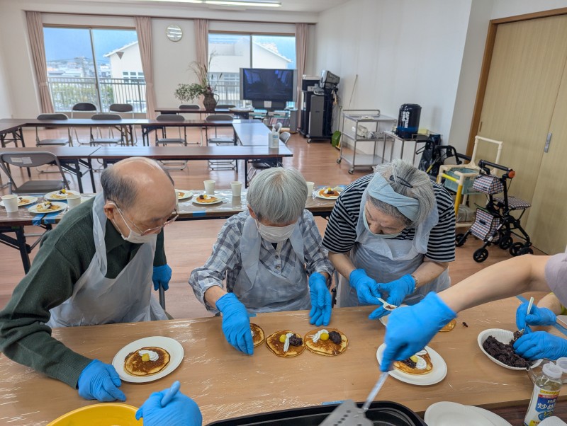 10/6は中秋の名月ということで、「お月見お茶会クッキング」として利用者のみなさんでホットケーキを作り会食をしました。