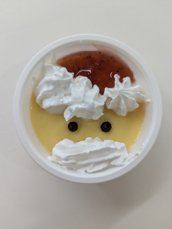 24日はサンタプリン、25日はチキンライス・エビフライ・クリームコロッケ・ミートグラタン・エビと玉ねぎのマリネ・クリスマスケーキを提供しました。