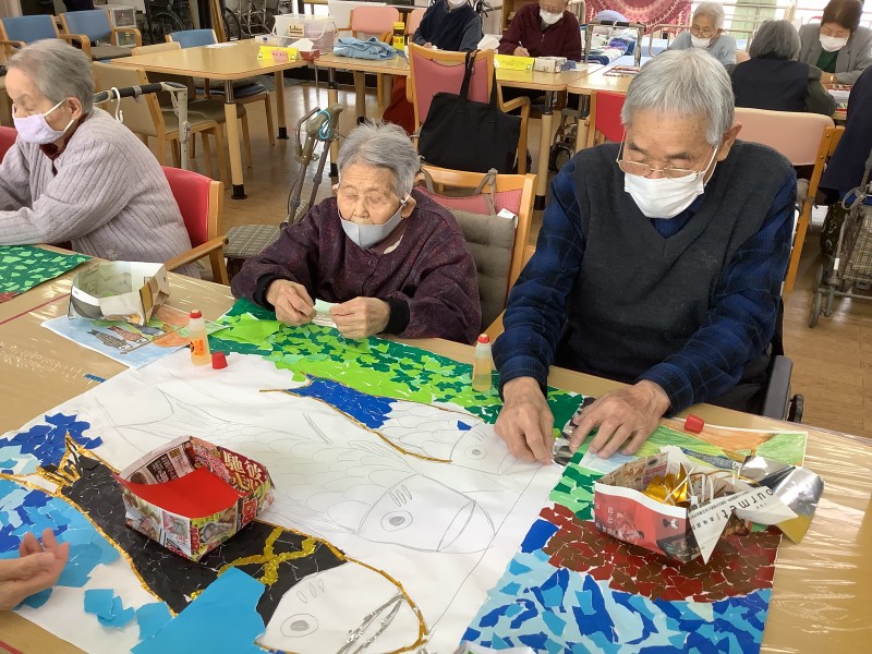 デイサービスでは利用者様と協力しながらこいのぼりの壁画作りを